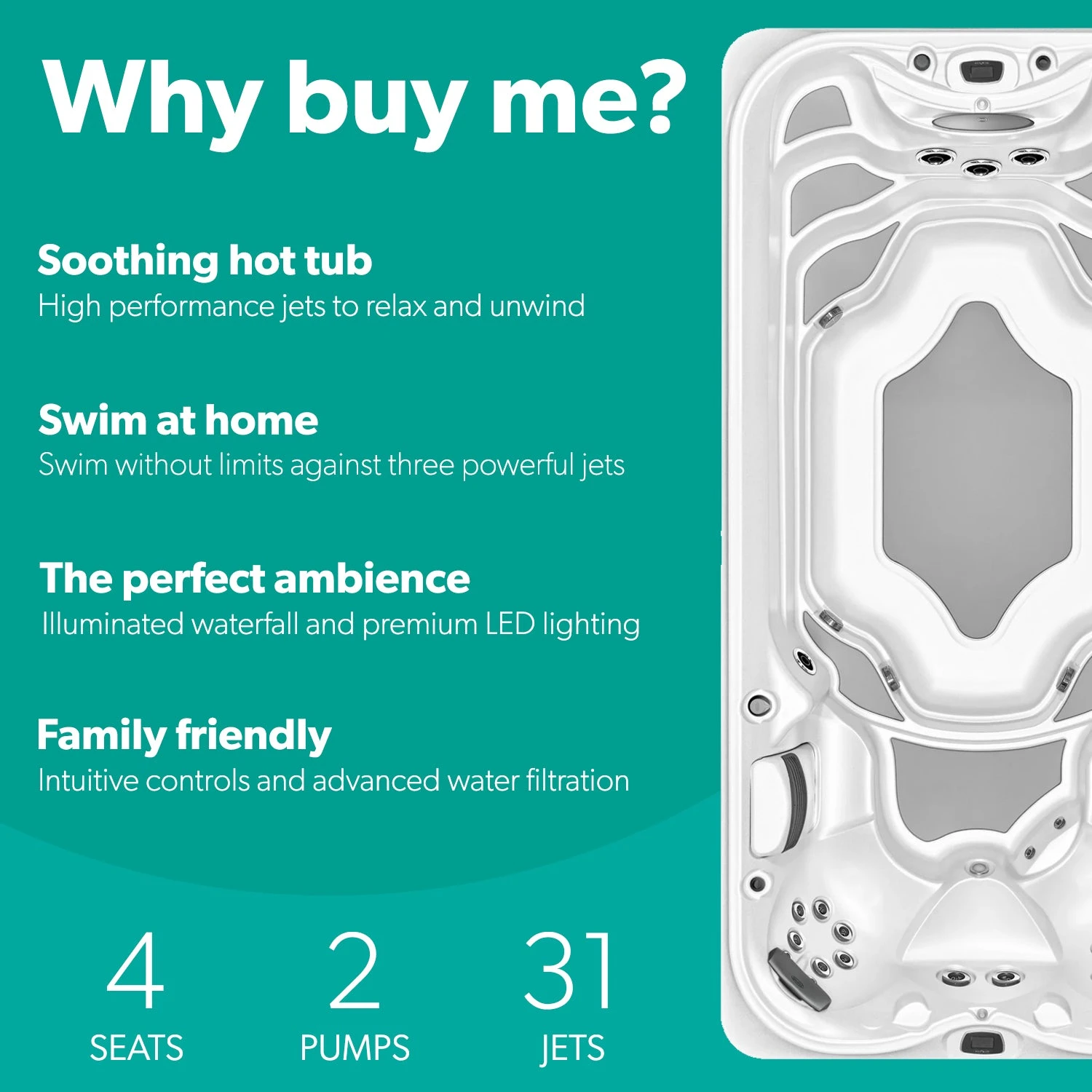 A swim spa combines all the hydrotherapy, wellness and relaxation benefits of a hot tub, with the added luxury of a swimming pool – all at a fraction of the cost of a pool.