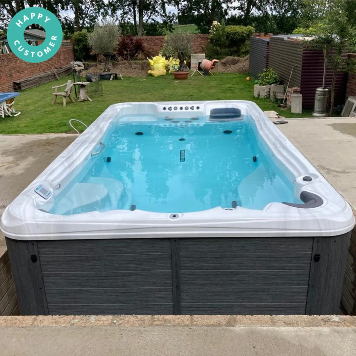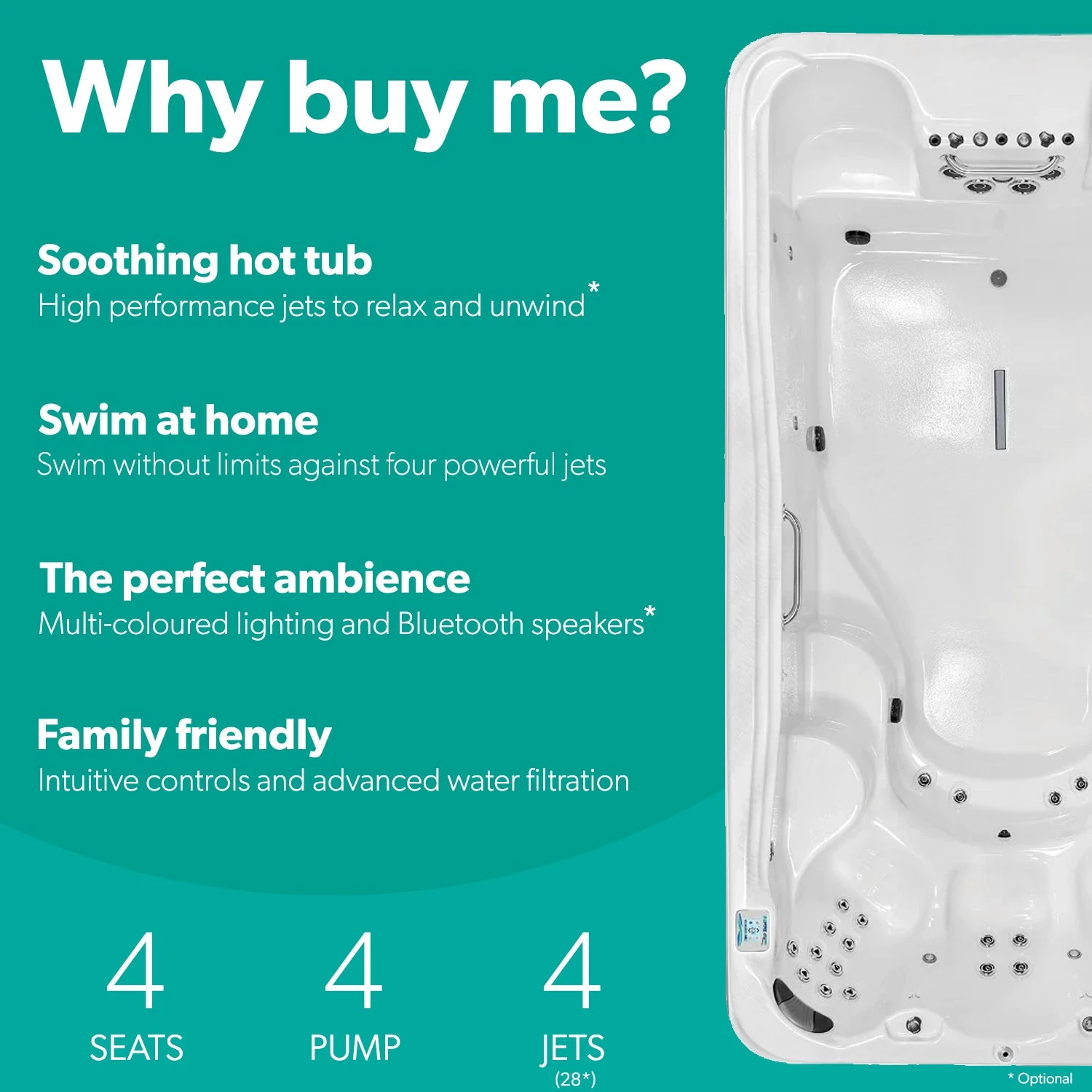 - Spacious 4-seater swim spa with quad swim jets